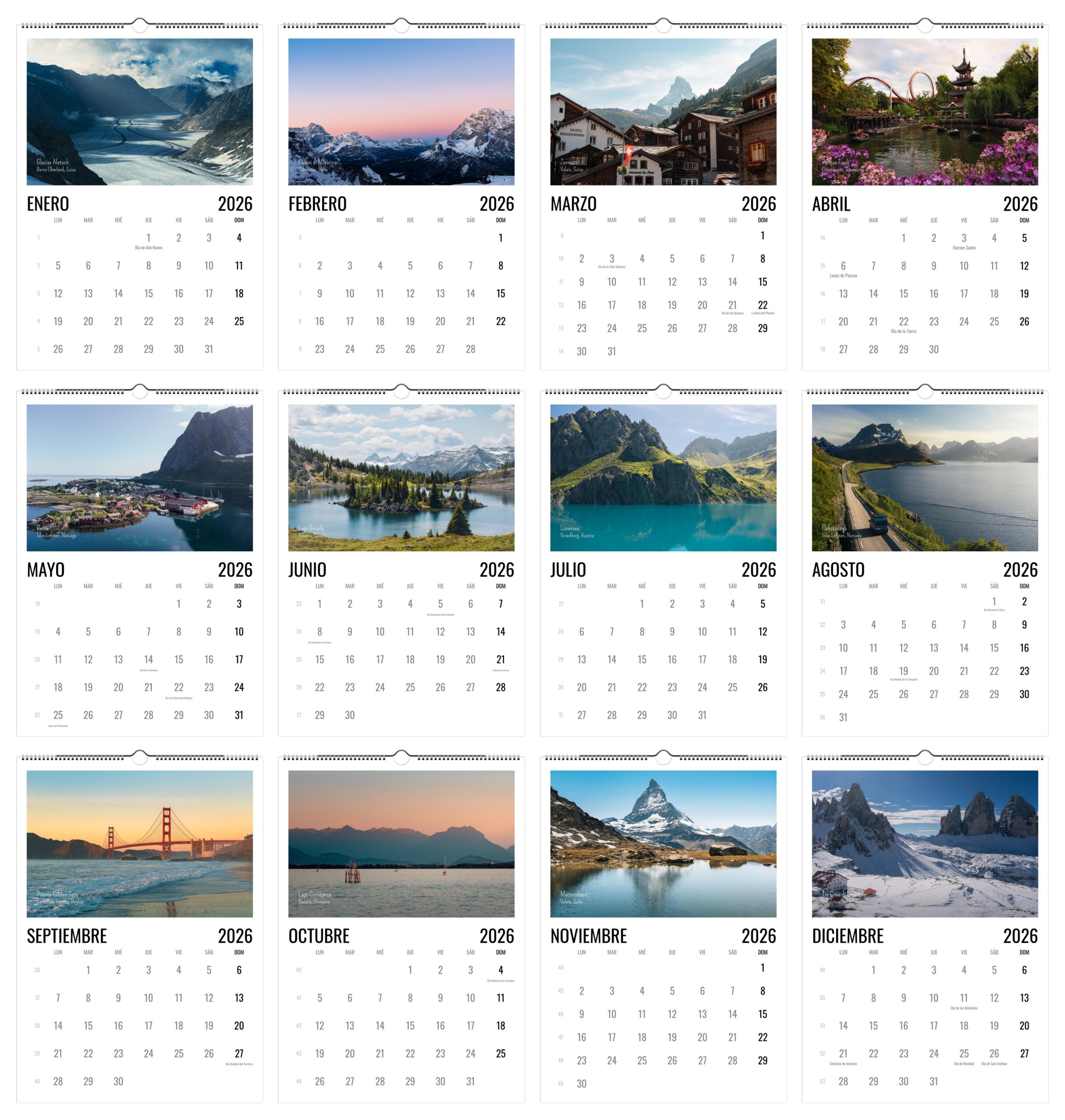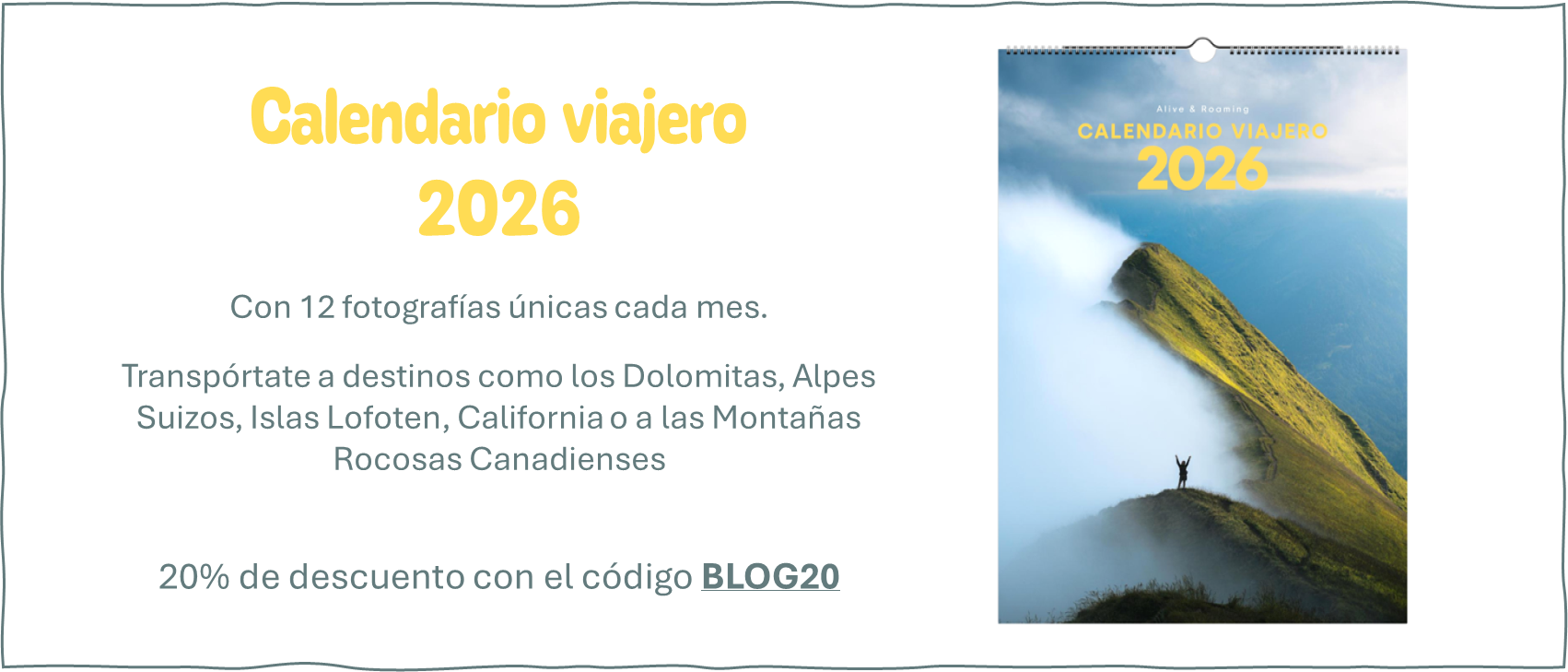 • Calendario fotográfico viajero de AliveandRoaming: es un regalo perfecto para viajeros y amantes de la montaña: 12 meses de paisajes reales de Suiza, Noruega, Canadá, Italia, y mucho más, captados por nosotros, pensado para inspirar nuevas aventuras cada vez que pasas la página. Un detalle original, práctico y lleno de naturaleza.