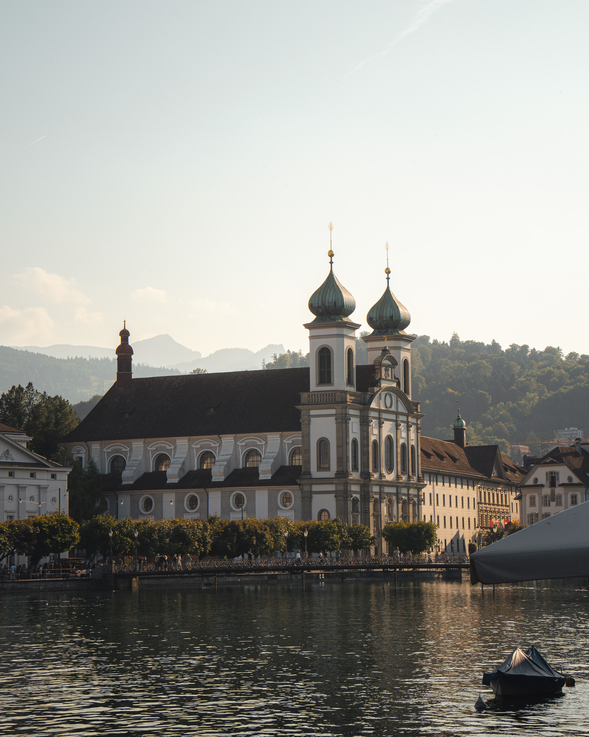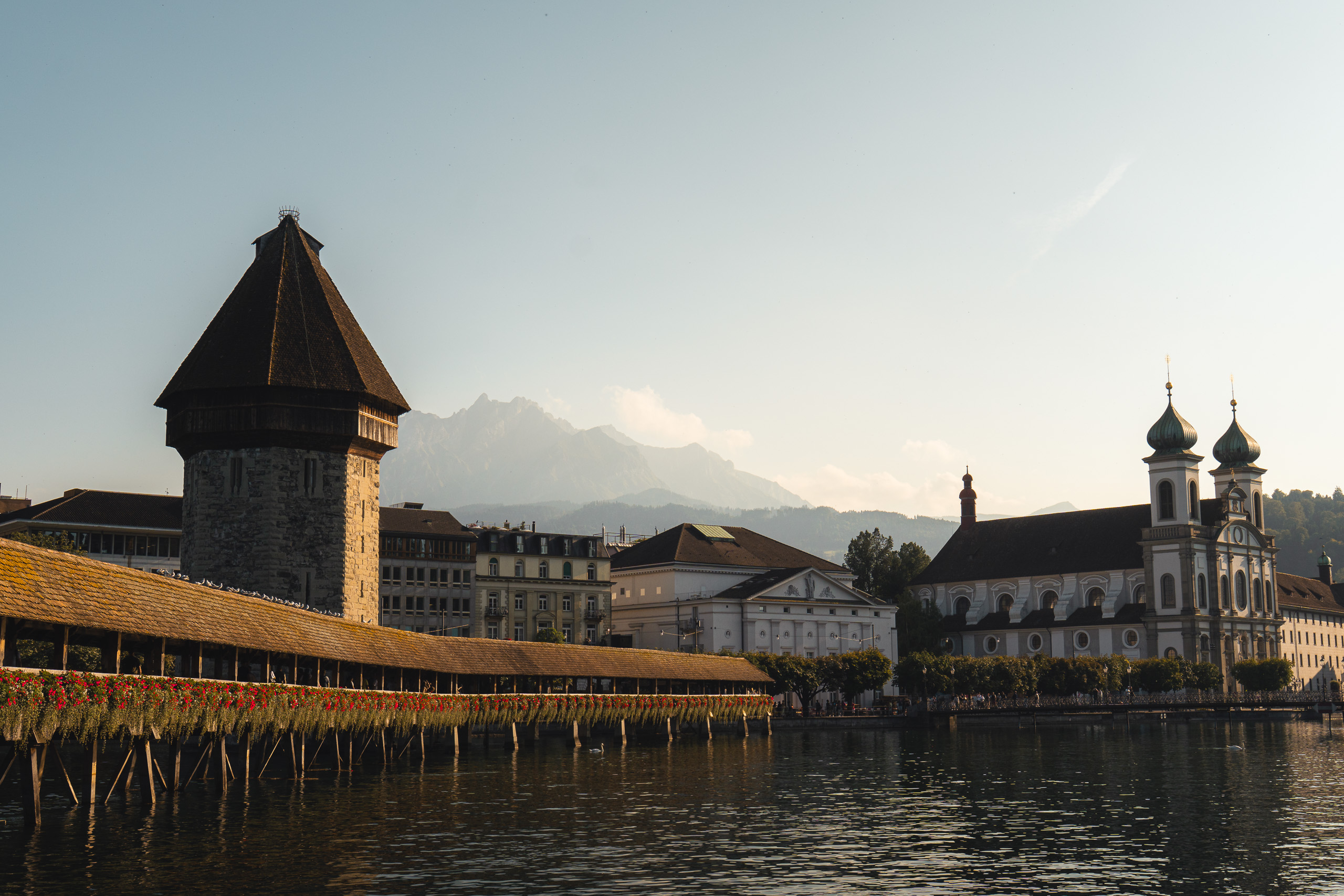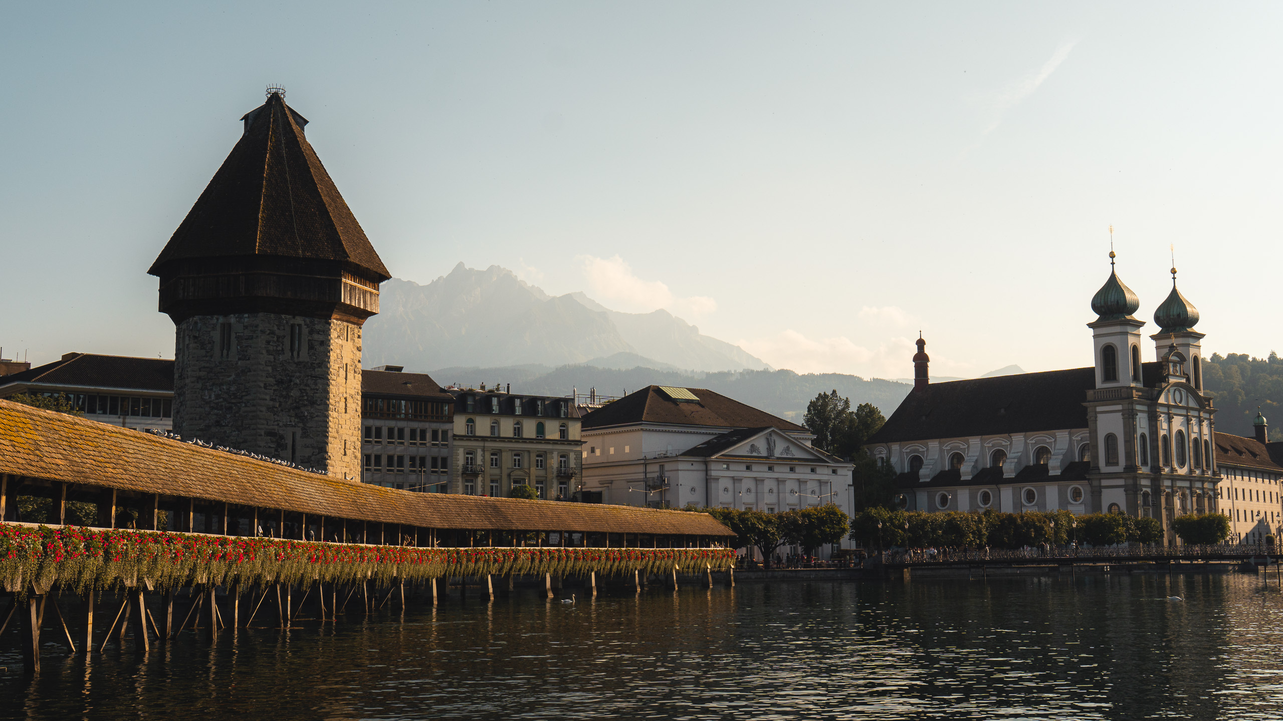 A la izquierda el famoso Puente de la Capilla o Kapellbrücke en alemán, a la derecha podéis ver la Iglesia de los Jesuitas
