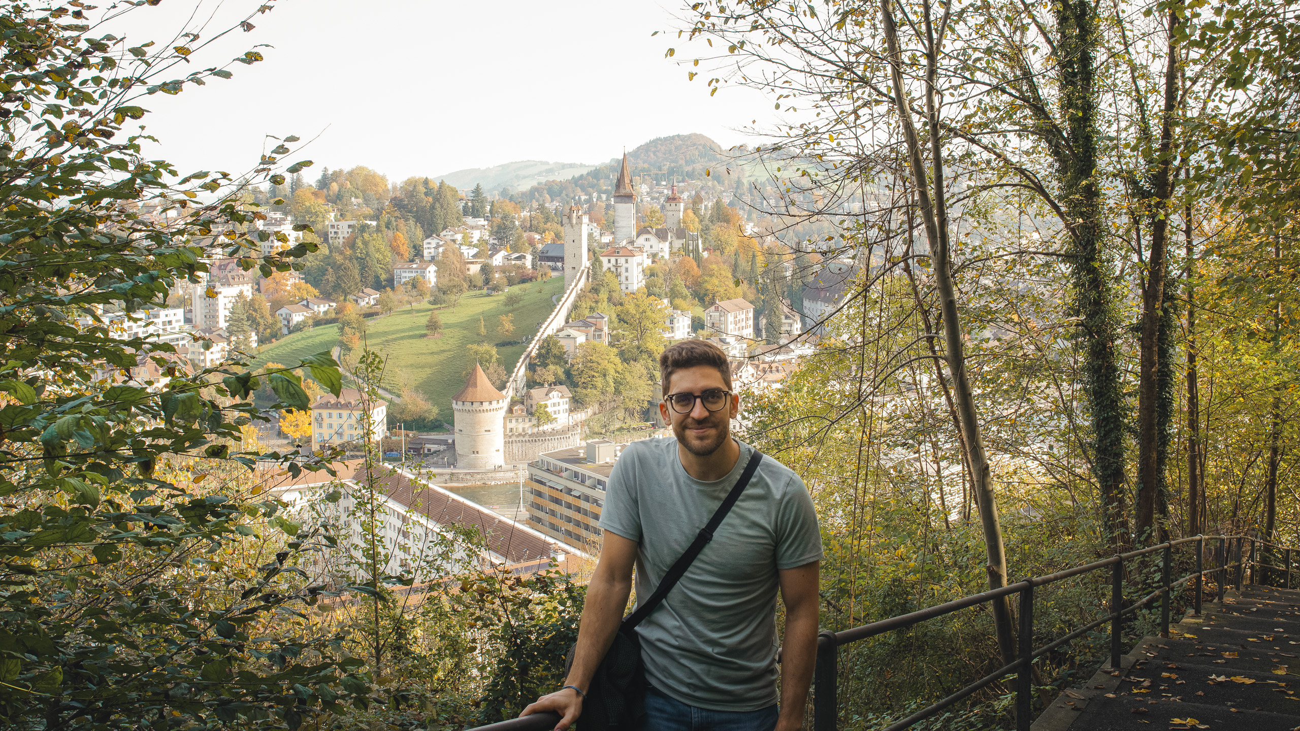Rubén en el mirador de Gütsch, al fondo podemos apreciar el casco antiguo y la Muralla de Musseg