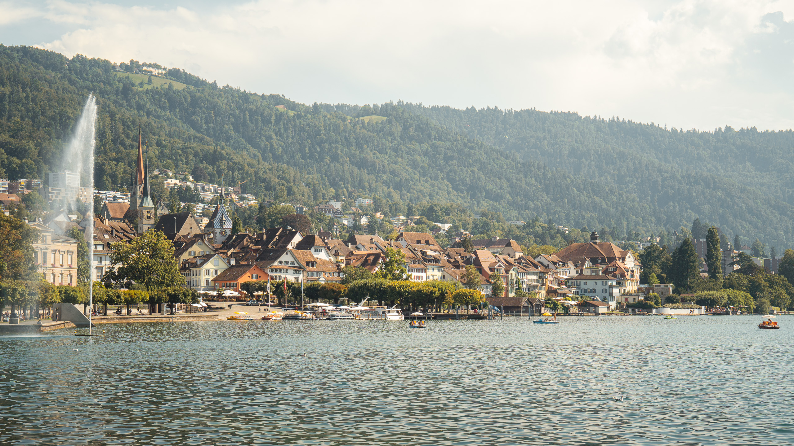 Se encuentra a solo media hora de Lucerna. Es una ciudad pequeña que se ha construido a las orillas del lago Zug. El casco antiguo es muy bonito, las casas están pintadas con colores pastel, y sus calles tienen mucho encanto. También podéis ver las torres medievales y hacer un paseo junto al lago. Es uno de los lugares más famosos en Suiza para ver el atardecer.