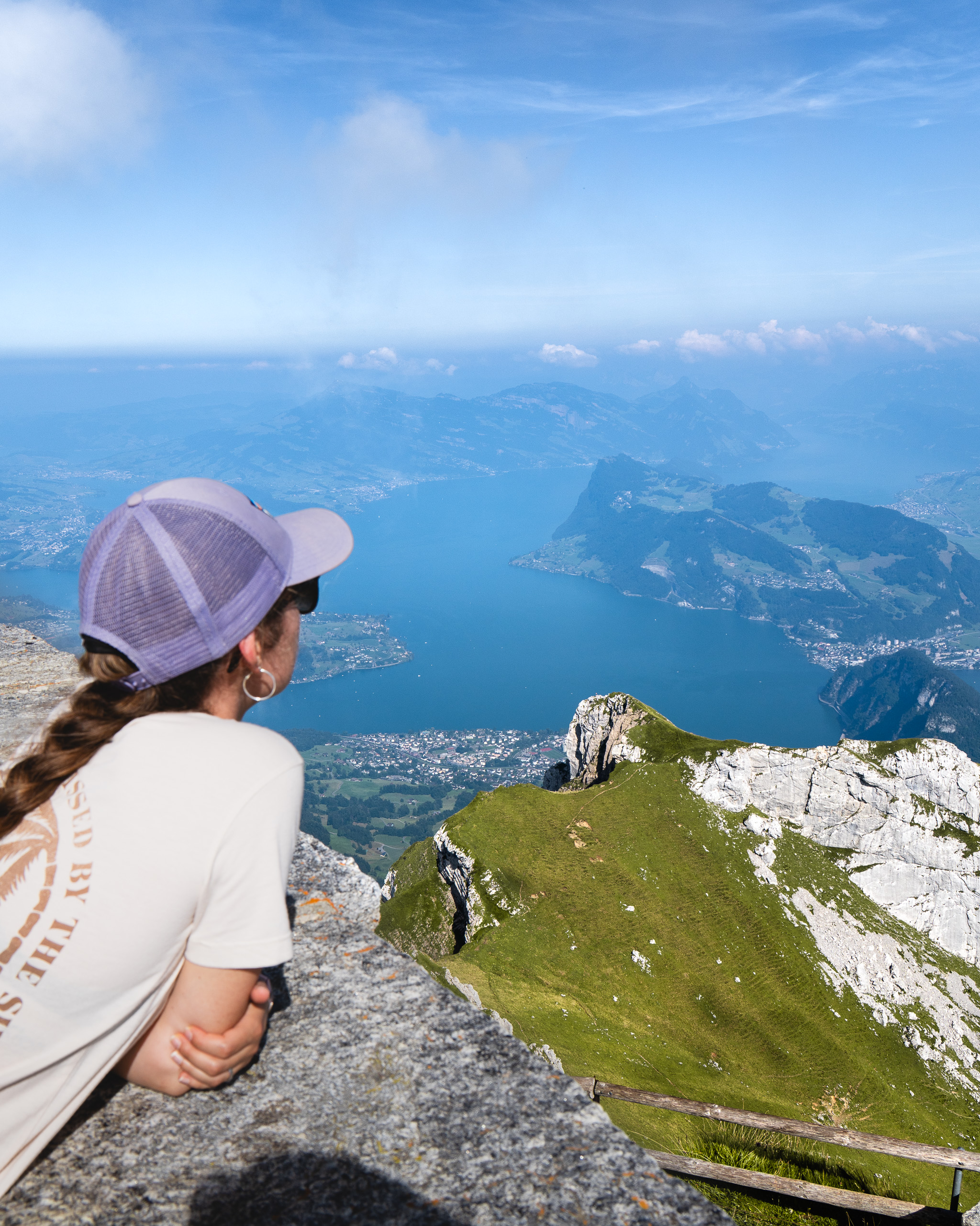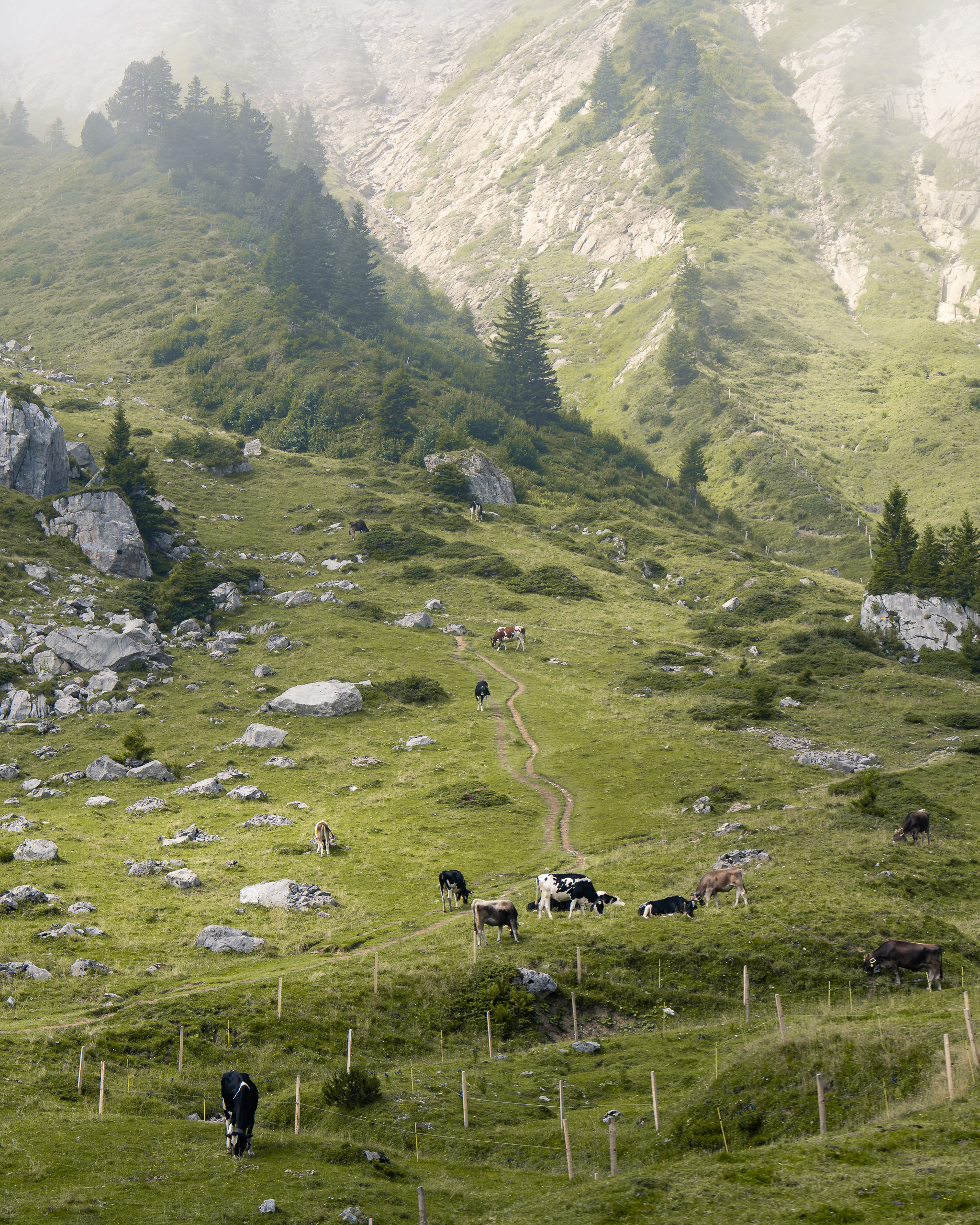 El camino discurre entre roca y praderas, con vistas constantes a los Alpes. En días despejados, se puede ver a lo lejos el Lago de los Cuatro Cantones.