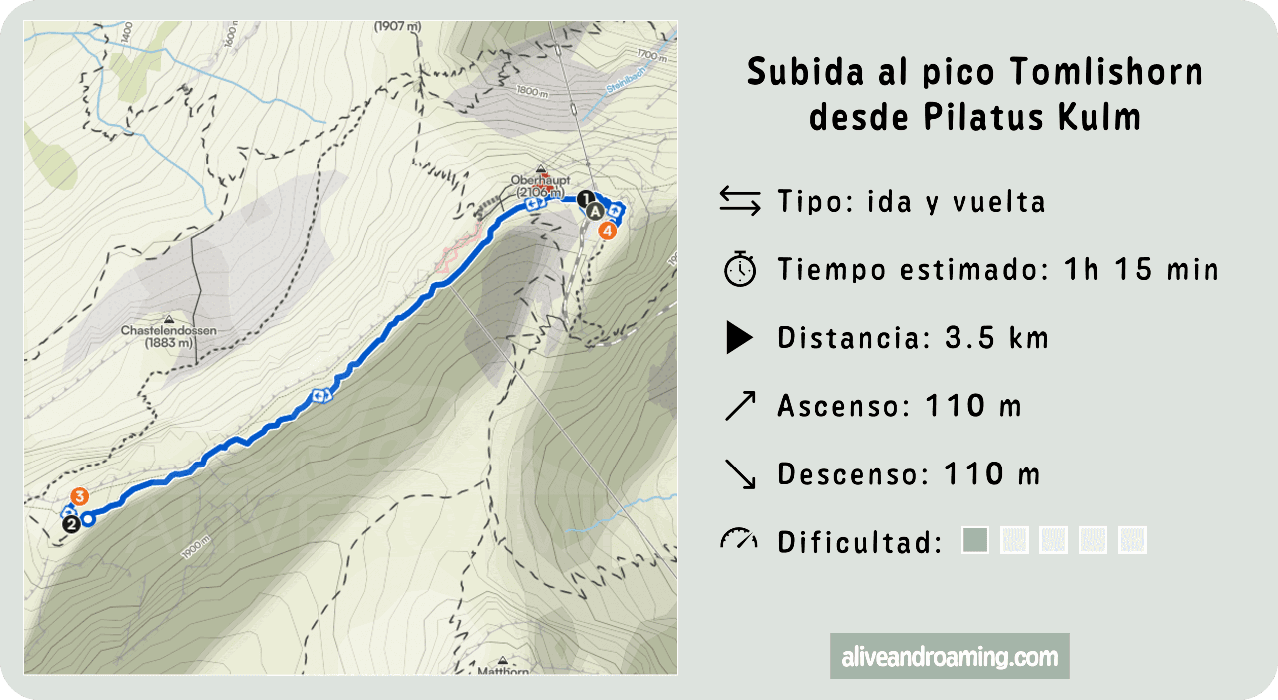 En nuestra opinión, si habéis hecho el esfuerzo (económico) de subir al Monte Pilatus desde Lucerna, merece la pena hacer alguna ruta, aunque sea corta, para disfrutar bien del entorno. Nosotros hicimos una ruta corta hasta uno de los puntos más altos del macizo, el Tomlishorn. Es un sendero muy sencillo, bien preparado y muy agradable, no conlleva grandes esfuerzos.