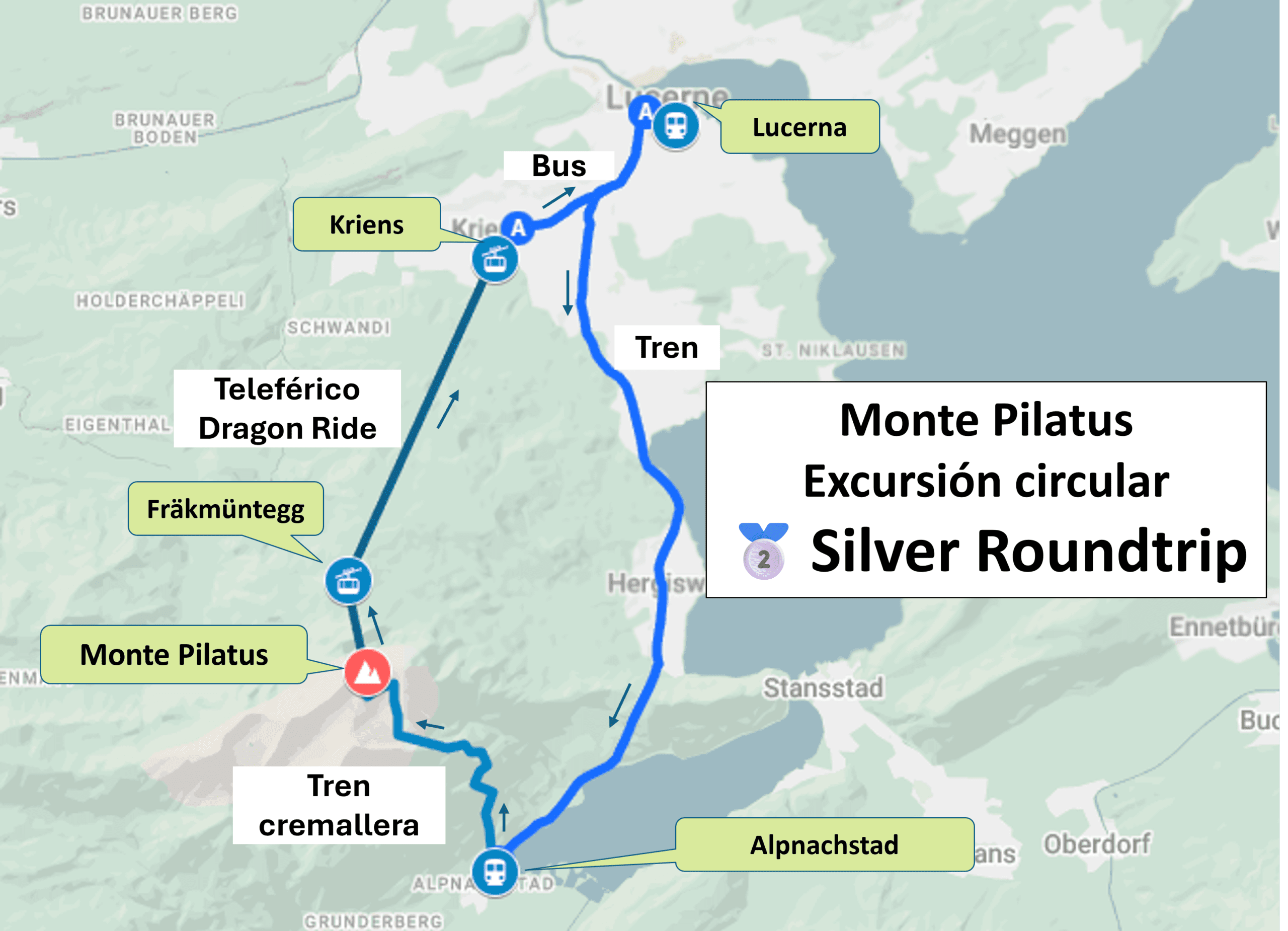 En nuestro caso visitamos el Monte Pilatus en familia, así que optamos por una opción más cómoda y accesible. Elegimos el Paquete Silver, subiendo en tren cremallera desde Alpnachstad y bajando en teleférico hasta Kriens.