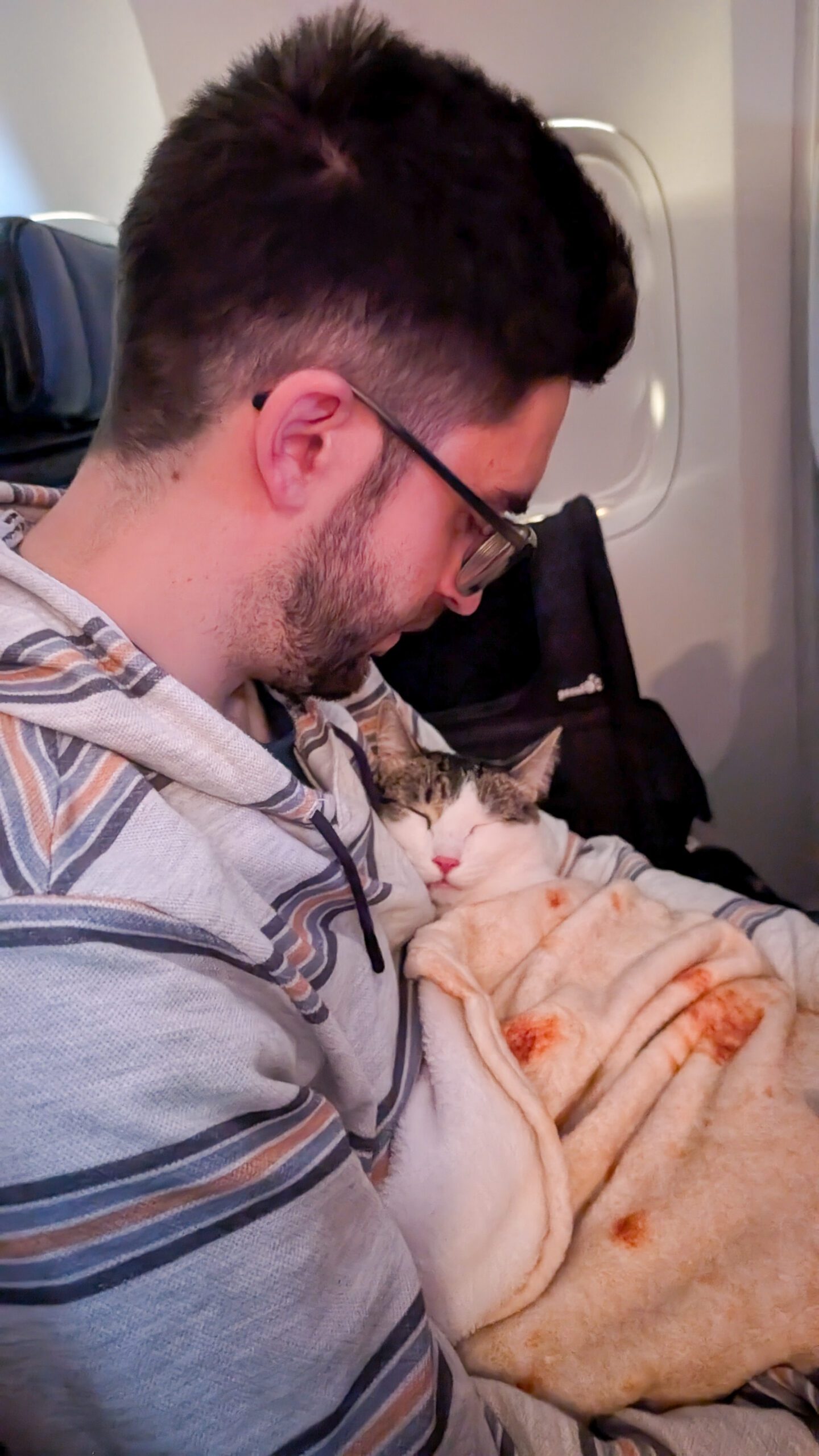 A pesar de que el vuelo fue mejor de lo que pensábamos, no dormimos ni un minuto. Y eso que los azafatos fueron súper majos, y nos hicieron la experiencia con el gato muy fácil. Para empezar, como en nuestra fila había un asiento vacío, nos permitieron subir el transportín de Bio y dejarle directamente en el asiento, a nuestra altura. Además, fueron muy flexibles y nos permitieron sacarle en contadas ocasiones para que estuviera tranquilo. Lo peor fue el despegue, después Bio llego a acostumbrarse al ruido y al traqueteo del avión y como iba con nosotros, fue bastante tranquilo. Nosotros no le dimos ninguna pastilla para que estuviera más tranquilo, pero esto os lo explicaré mejor en la entrada dedicada a volar con gato en avión.