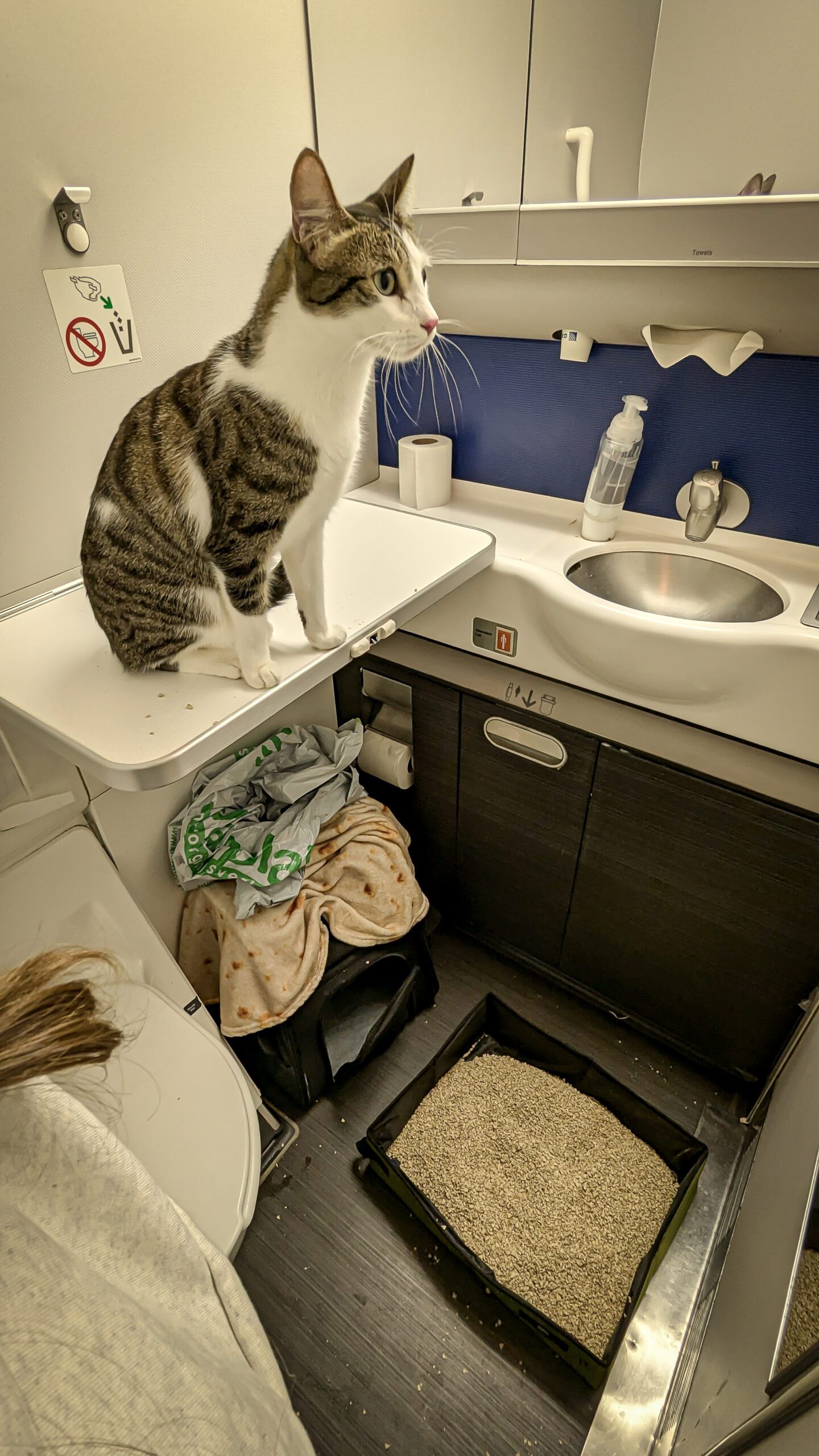 Lo que hacíamos era levantarnos cada 2 horas, a no ser que Bio se hubiera quedado dormido, y le llevábamos al servicio. Uno de los baños era más amplio y tenía espacio suficiente. Así le sacábamos, para que se estirase un poco y pudiera usar su arenero.